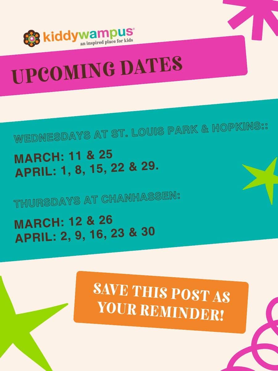 Kiddywampus Storytimes are Wednesdays at 10am in St. Louis Park, Wednesdays at 11:15am in Hopkins and Thursdays at 10:30am in Chanhassen through end of April. For ages 2-5 but caregivers and siblings are welcome. Visit the Kiddywampus Facebook page for their latest updates.