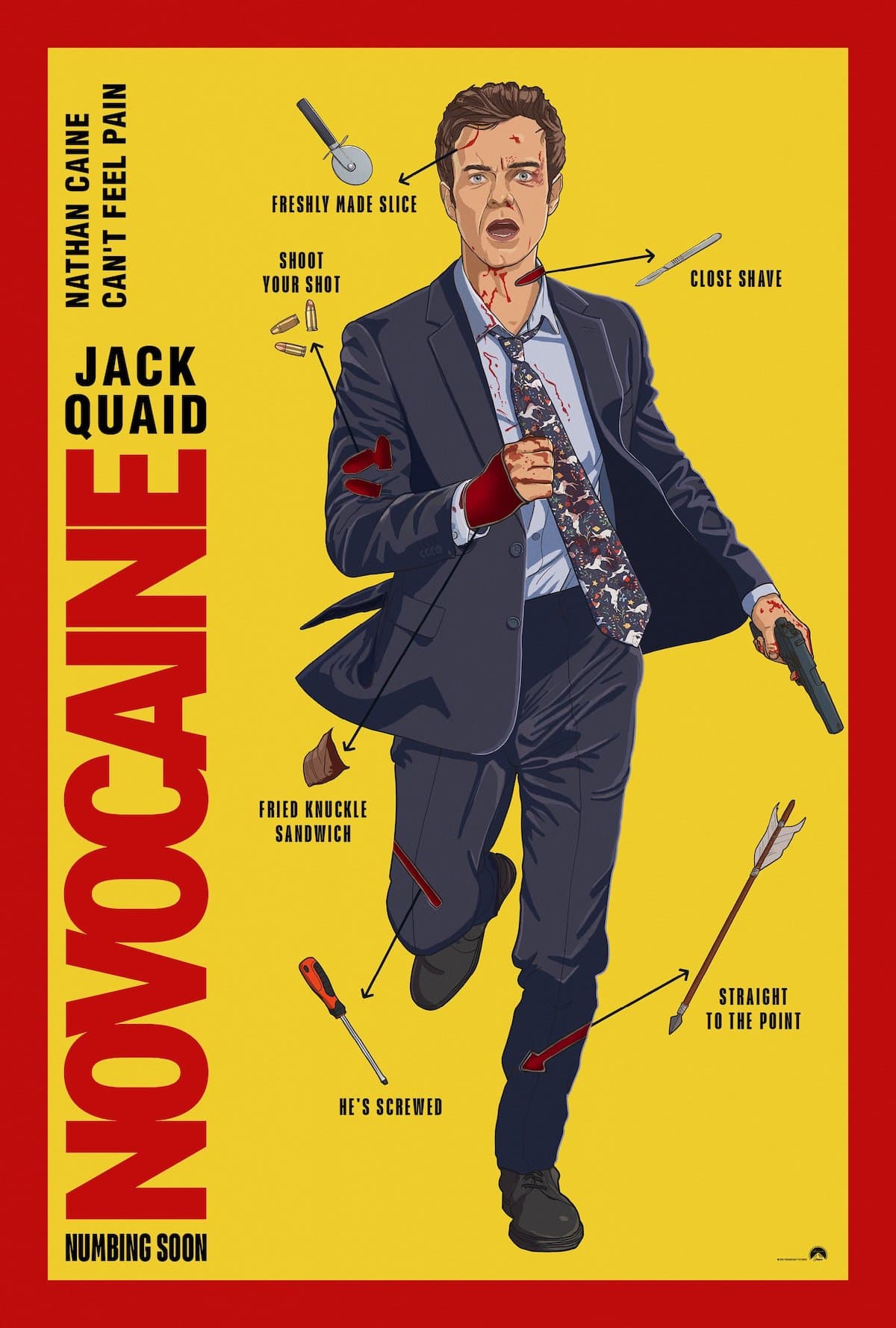 Novocaine is directed by Dan Berk and Robert Olsen and written by Lars Jacobson. It stars Jack Quaid as Nathan Caine, alongside Amber Midthunder, Ray Nicholson, Jacob Batalon, Betty Gabriel, and Matt Walsh.