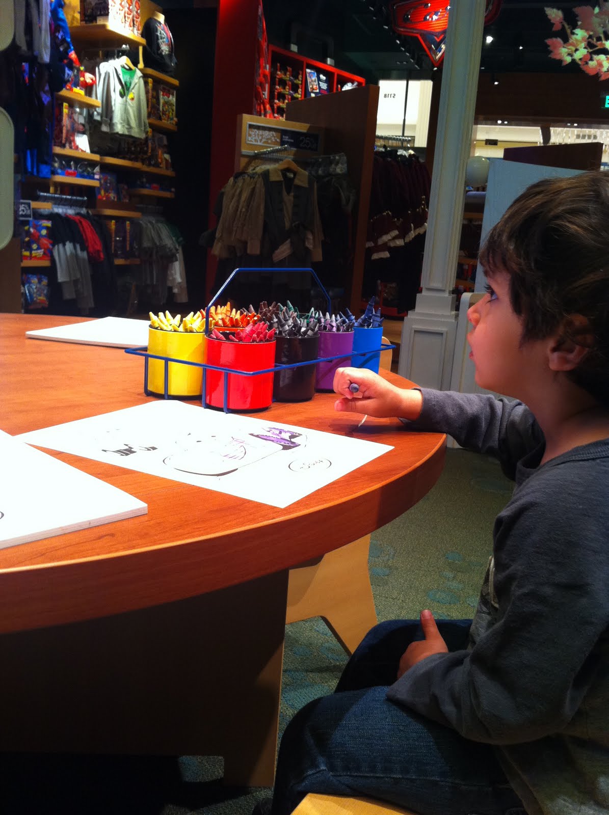 It was pretty cool to be the very first guests in the new store! I had a personal tour from Gail, the store manager, while my 3-year-old nephew enjoyed himself in the Disney Store Theatre watching movies (mostly Cars 2 – his favorite) on the big screen and coloring Toy Story and Cars pictures.